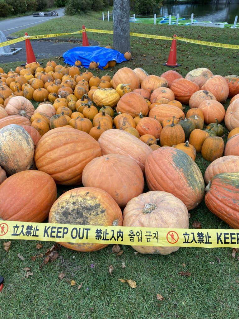 大沼公園では、自然の景色を楽しみながら散策をし、大きなカボチャの山を見ることもできました。
