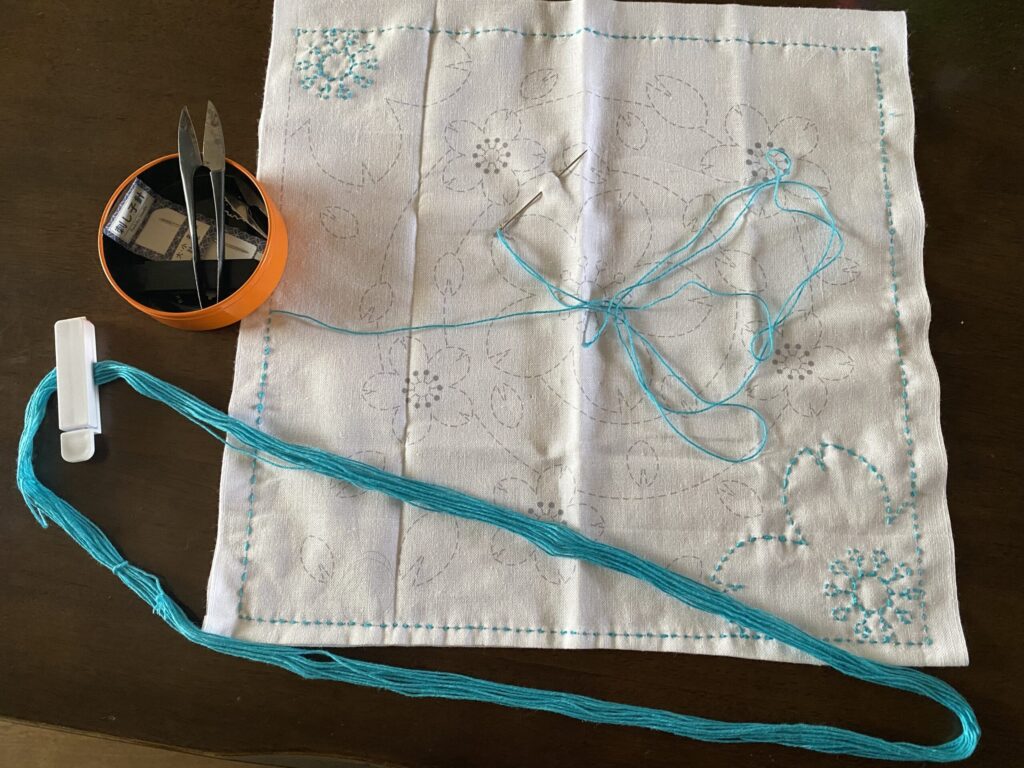 そして今回は、次の布巾に取りかかるために、青いきれいな糸を選びました。