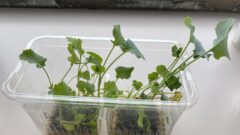 現在、双葉の出た2本の小さなレモンの苗を大切に育てています。