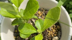 敷地内を歩くと、手前の木は丸みを帯びた形に、奥の同じ種類の木はきっちりと三角錐に仕立てられています。