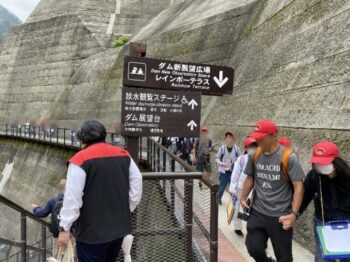 展望台から放水や周りの山々の新緑とわずかに残る雪を眺め、慎重に階段を降りながら、ダムへと足を進めました。スロープを歩いて最後に階段を登るコースでした。