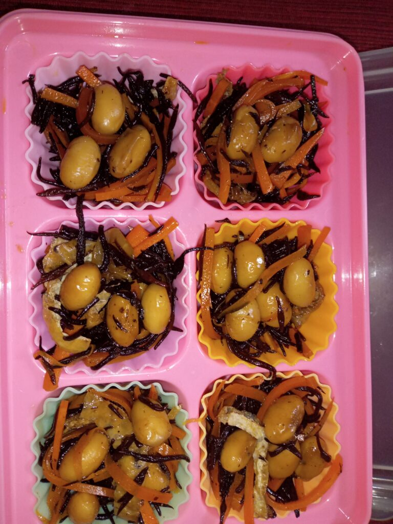 主菜・副菜としては、冷凍してあるひじきや切り干し大根の煮物、きんぴら、そして卵料理があれば、私のお弁当は十分です。