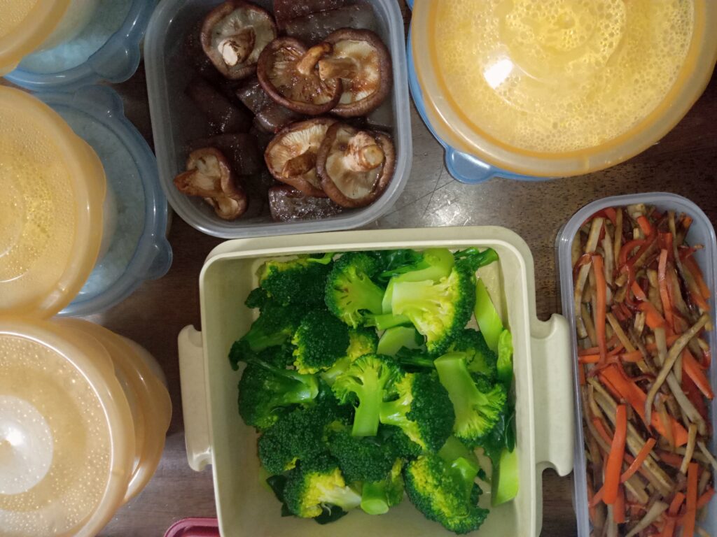 休日には、ヒジキの煮物を作ったりブロッコリーをゆでたりして、冷凍したり、冷蔵したり・・必ず作るのは、ゆで卵と冷凍ごはんです。ゆで卵は5個くらい作って、朝のサラダに入れたりお弁当に入れたりします。