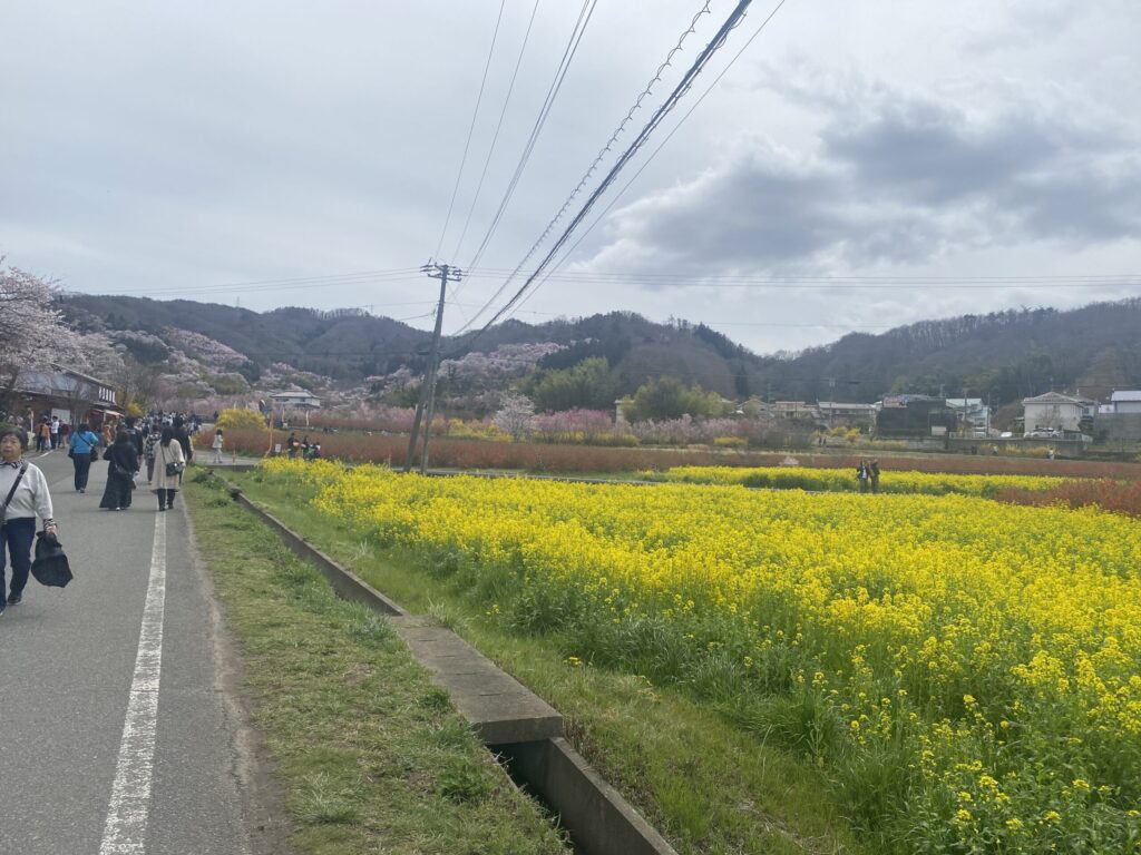 花見山へ向かう道の途中でも、菜の花が咲き、見上げれば山一面に広がる花々が目に入り、歩く時間そのものが楽しみになります。