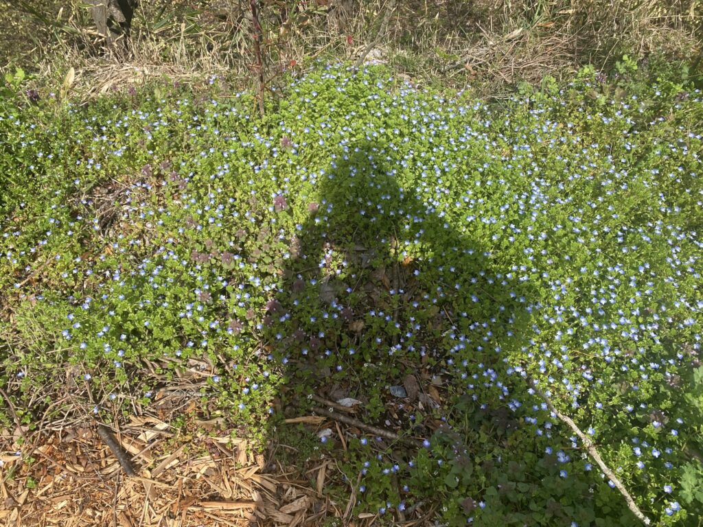 ふと立ち止まり、オオイヌフグリの群生にカメラを向けると、思いがけず自分の影も一緒に写り込みました。