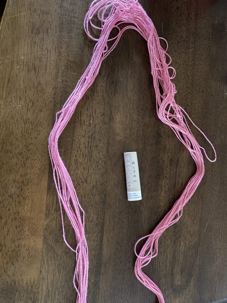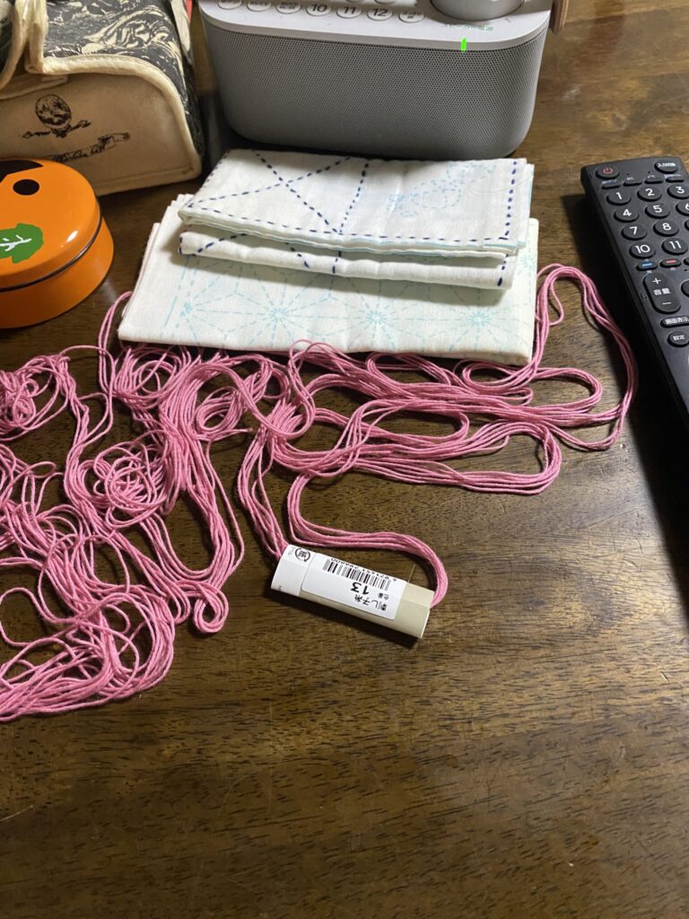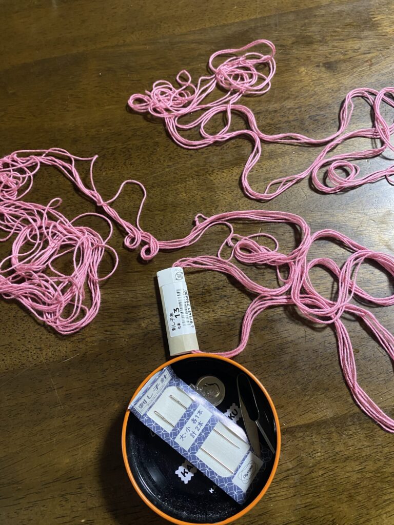 以前使った材料も少し残っていましたが、今回はあえて新しくピンクの糸を選びました。
