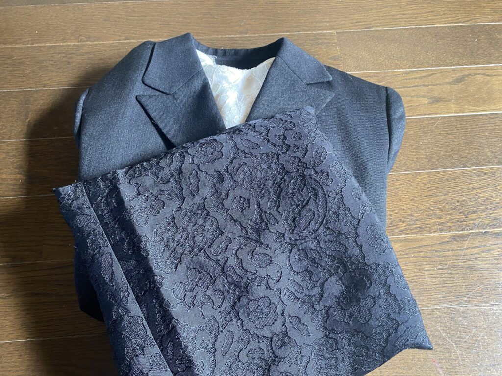 服装は、濃紺のスーツに見える上着にレース模様のスカート、ブラウスはレース入りの白、黒い靴で臨みました。