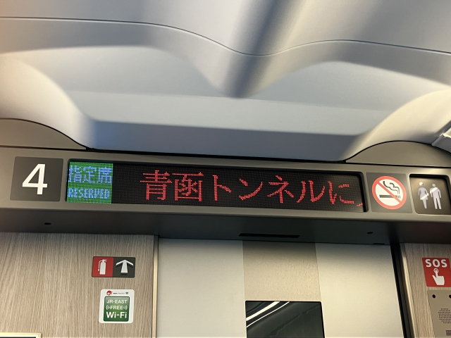 列車がトンネルに入ったとき、車内の電光掲示板に赤い文字で