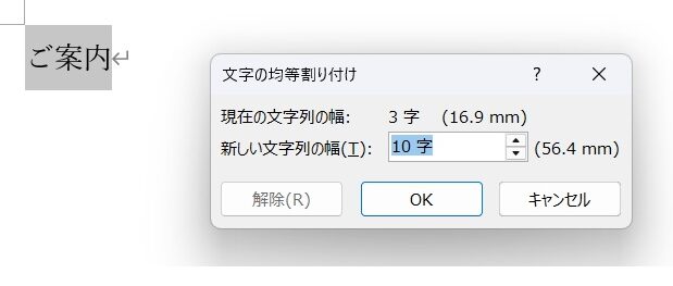 - ホームタブ → 「文字の均等割り付け」 → 好きな幅を指定(例:10文字分)